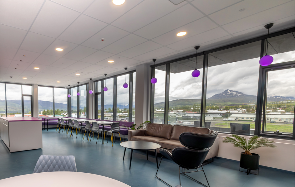 Hönnunin er í sama anda og höfuðstöðvar okkar í Reykjavík, með björtum litum, góðri lýsingu og frábærri hljóðvist. Þetta skapar fjölbreytt og sveigjanlegt vinnuumhverfi þar sem starfsfólk getur unnið bæði sjálfstætt og í teymum.