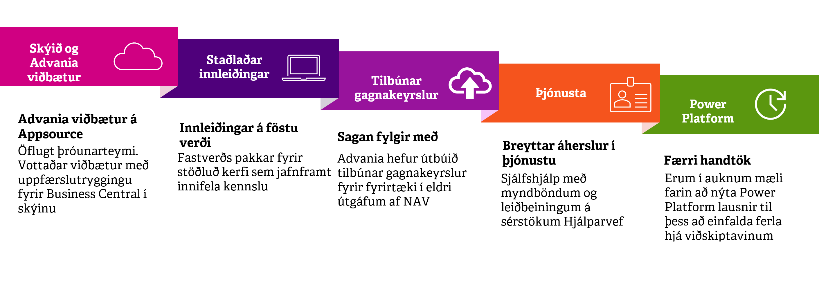Stefna Advania í þessari vegferð er að bjóða okkar lausnir á breiðum markaði. Við gefum allar okkar lykilviðbætur fyrir Business Central út á markaðstorgi Microsoft (Appsource) ásamt því að tryggja að þær séu samhæfðar nýjustu útgáfu Business Central hverju sinni. Allar okkar viðbætur eru vottaðar af Microsoft og í boði prufuaðgangur að þeim í 30 daga. Við kynnum reglulega nýja virkni i viðbótunum okkar og tökum vel í tillögur og hugmyndir okkar viðskiptavina að nýjum eiginleikum eða lausnum.