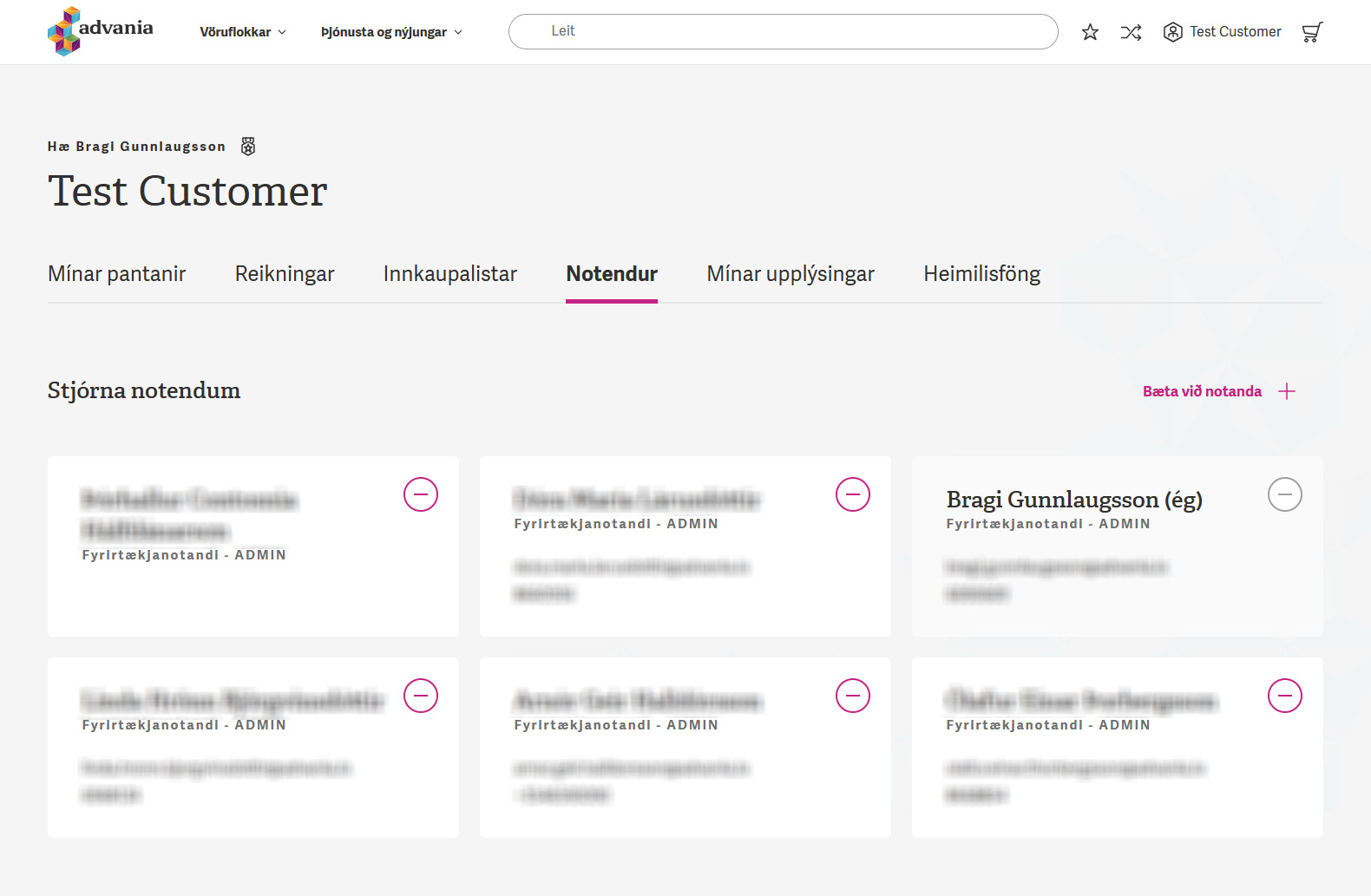 Á mínum síðum er hægt að sjá allar pantanir, niðurhala reikningum og sinna notendaumsýslu. Þar geta notendur sýslað með innkaupalista og admin notendur geta jafnvel útbúið lista sem hægt er að deila með öðrum notendum innan fyrirtækisins.