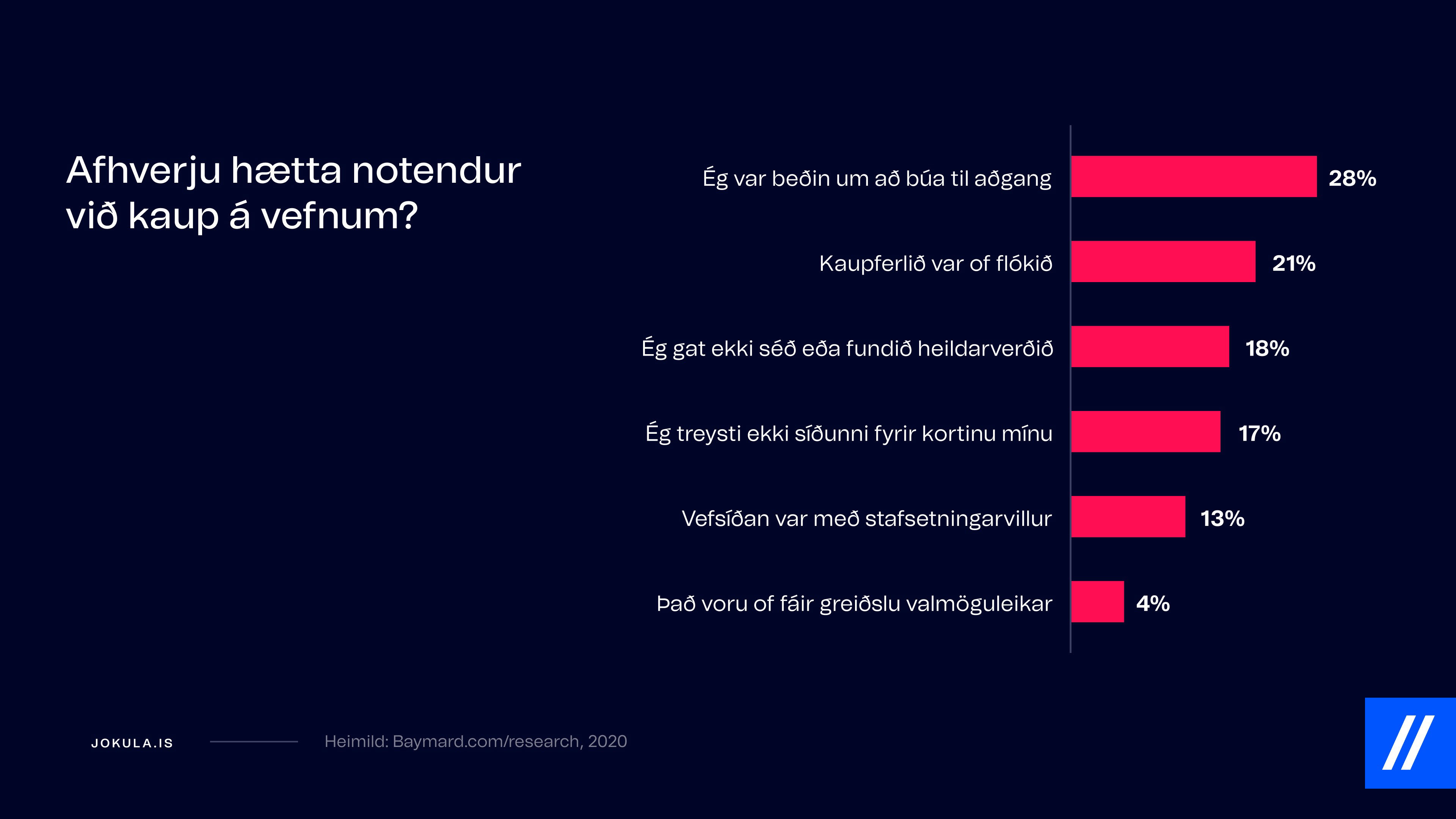Ein rannsókn sem var gerð árið 2020 um af hverju notendur hætta við kaup á vefnum sýnir að einfaldir hlutir eru að hafa áhrif á þetta. Til dæmis getur það að krefja notanda um að búa til aðgang á vefnum eða að sýna ekki heildarverðið á kaupunum virkað mjög fráhrindandi fyrir notendur.