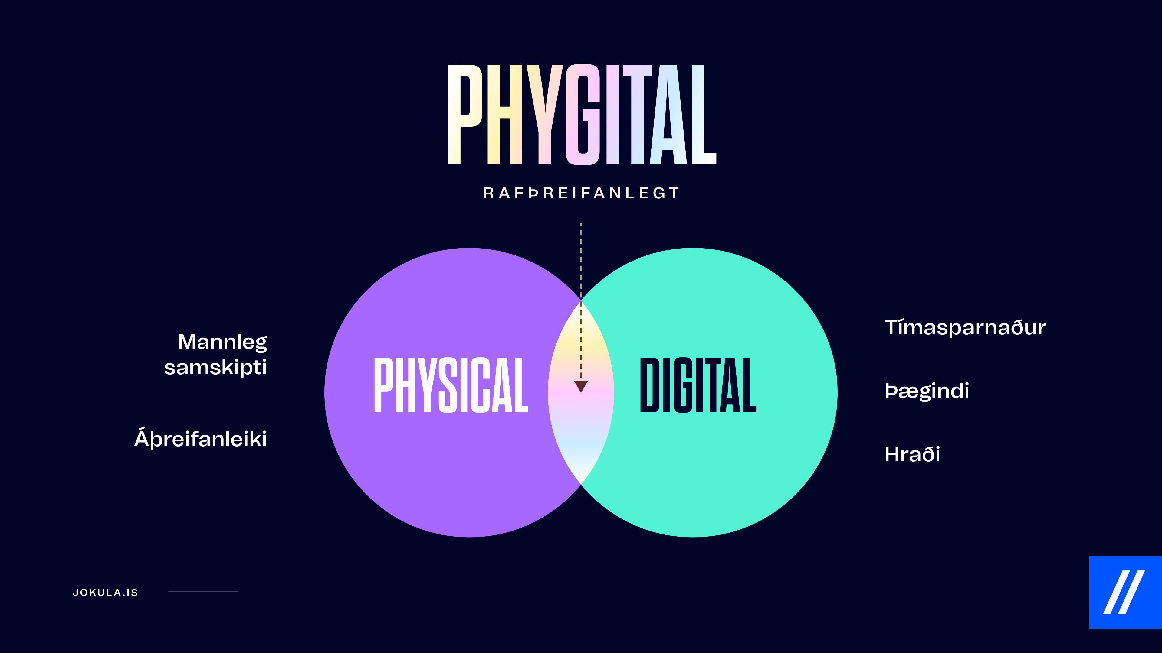 Hugtakið phygital eða rafþreifanlegt er hugtak sem fyrirtæki þurfa að hafa í huga þegar kemur að stafrænni upplifun. Phygital er "the sweet spot" þar sem raunheimur og stafrænn heimur mætast og mynda saman heildarupplifun. Við viljum öll hraðann, þægindin og tímasparnaðinn sem stafræni heimurinn gefur okkur en við viljum líka mannleg samskipti og áþreifanleikann sem raunheimur gefur okkur.