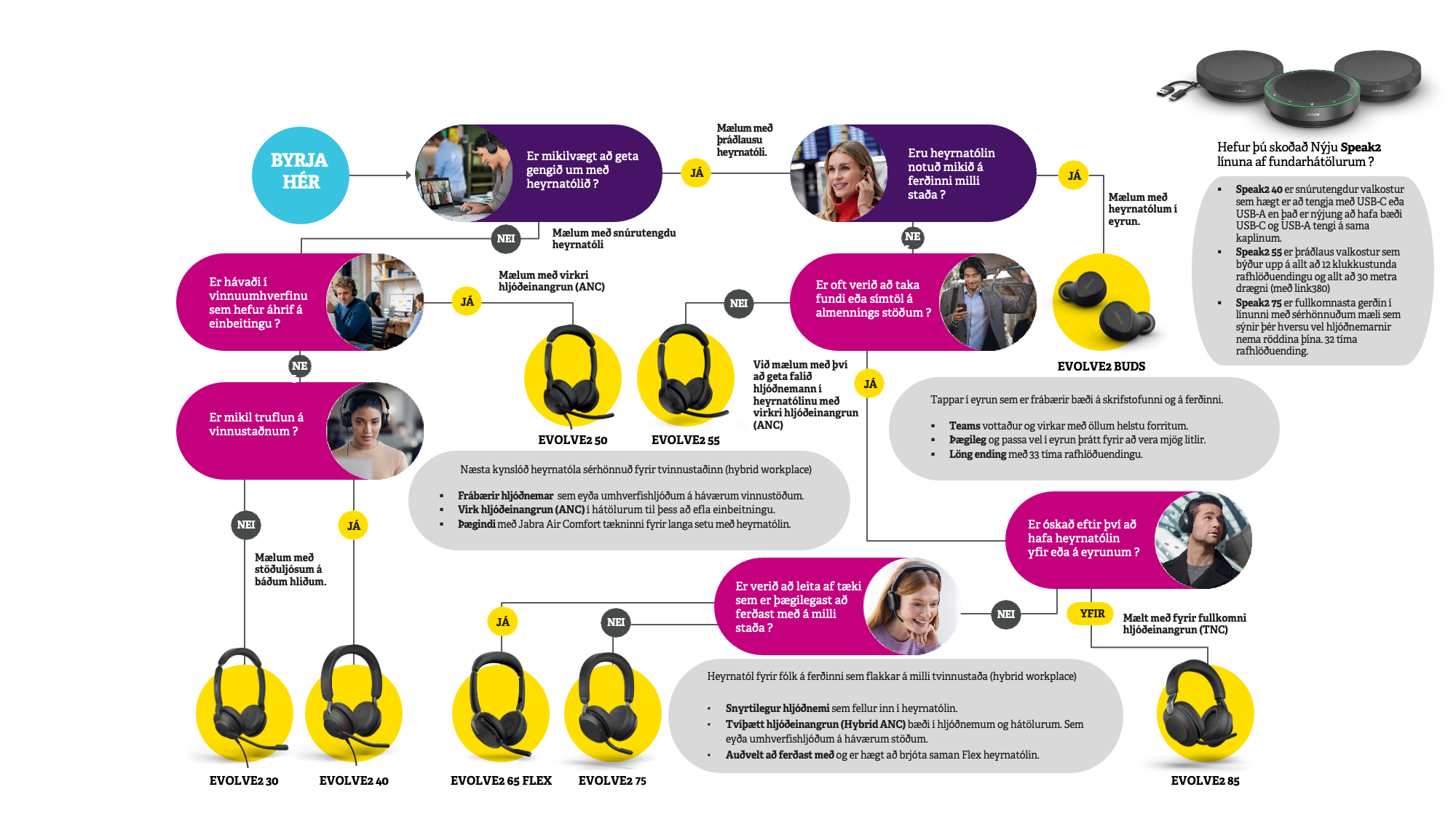 Jabra hefur um langt skeið verið leiðandi í heiminum þegar kemur að heyrnartólum og fundahátölurum. Nýlega kynnti Jabra til sögunnar nýjar útgáfur af vinsælu Evolve og Speak línunum sínum, sem eru sérstaklega hannaðar til að styðja við kröfur tvinnustaðarins (Hybrid Workplace).